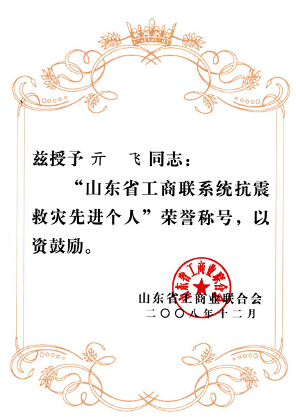 • > 董事長兼總經理亓飛授予“山東省希望工程圓夢行動貢獻個人榮譽稱